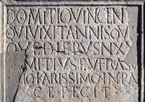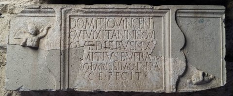 - Domitio Vincen[tio] qui vixit annis qu[in]que diebus numero XX / [Do]mitius Eufrasu[s] / [fi]lio karissimo in pa/ce fecit
