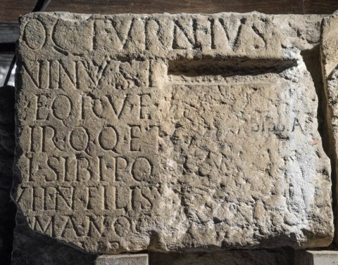 - --- N]octurnius [---] / [---]ninus +[---] / [---] eq(es?) RVE[---] / [---]vir Q()Q() et [---] / [---]i sibi po[s(uit?) ---] /[---]VII n(ummis?) filis [---] / [---]ma Noc[turni? filia? ---] / [---