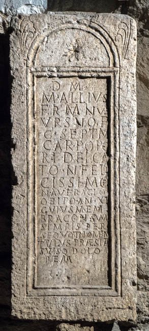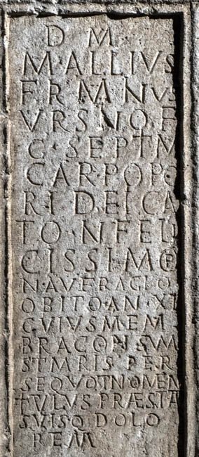 - D(is) M(anibus) / M(arcus) Allius / Firminus / Ursino f(ilio) / C(ai) Septimi / Carpop(h)o/ri delica/to infeli/cissimo p(uero) / naufragio / obito an(norum) XI / cuius mem/bra consum(p)/sit maris(!) per / se quot nomen / titulus praestat / suisq(ue) dolo/rem