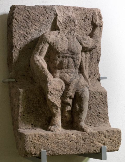 - Mythische Figur: Hochrelief mit thronendem Jupiter, Mantel auf der linken Schulter, linker Arm erhoben.