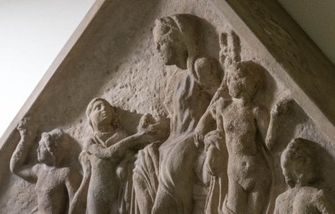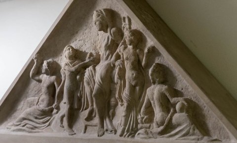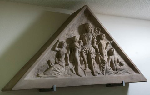 - Mythische Figuren: im Zentrum auf einem Polstersitz mit gedrechselten Beinen und Schemel Göttin (?) mit Schleier und kurzer Tunica, Caduceus im linken Arm. Flankiert wird die Gottheit von einem auf sie zutretenden Jüngling und einer am Sitz lehnenden weiblichen Figur, beide nackt bis auf einen Mantel. In den Giebelecken links gelagerte Nymphe (Tellus ?) mit Füllhorn, rechts gelagerte Quellnymphe (? Flussgott ?) in Rückenansicht.