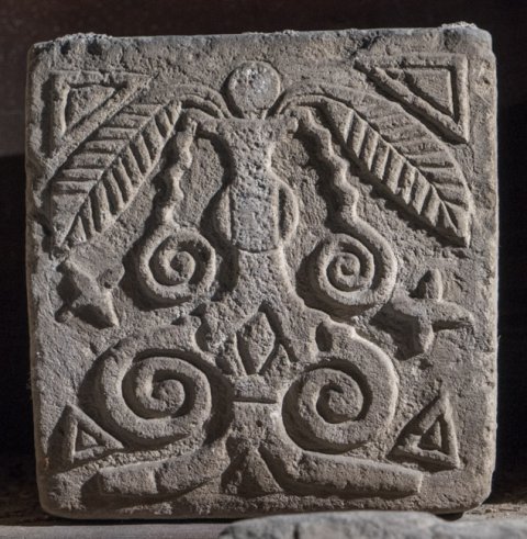 - Auf einer Seite ornamentales Relief (Gefäß mit Ranken und Blättern, darunter stilisierter Pflanzenkelch (?), seitlich zwei Sterne und vier Dreiecke).
