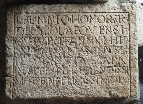 - L(ucio) Bennio Honorato / dec(urioni) col(oniae) Aequensi(um) / qui vixit ann(os) X(?) m(enses) III / L(ucius) Bennius Maximus et / Flavia Tertulla pa/rentes filio pientissi/mo et infelicissimo pos(uerunt)