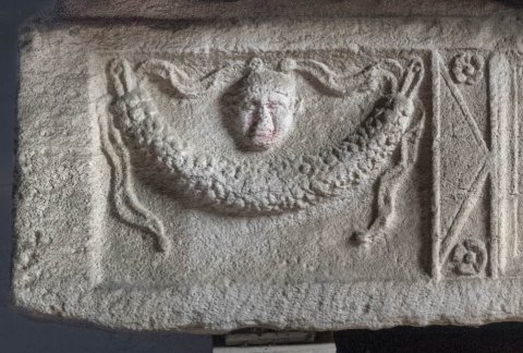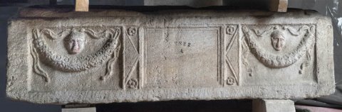 - Vorderseite: leere tabula ansata mit Rosetten in den Zwickeln. Seitenfelder mit Masken über Girlande mit Tänien. Nebenseiten: Girlande und Bukranion bzw. Maske.