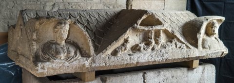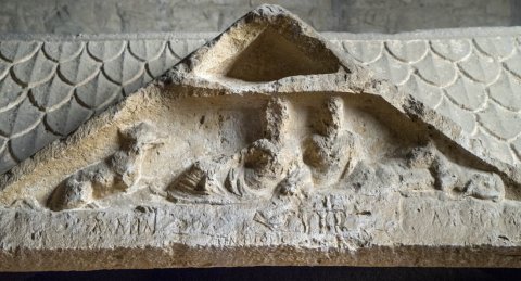 - Dachförmiger Deckel mit Blattschuppen, Eckakroteren und Mittelgiebel auf der Vorderseite. In den Akroteren links Büste einer Frau in Tunica und Mantel, severische Frisur, rechts Büste eines Mannes in Toga contabulata. Im Giebel Totenmahl: gelagertes Ehepaar zwischen zwei liegenden Hunden, vorn auf dem Deckelrand Tischchen mit Speisen, daneben Vogel. Auf den Nebenseiten Giebelfelder mit ascia (links) und Kranz zwischen Palmettenakroteren.