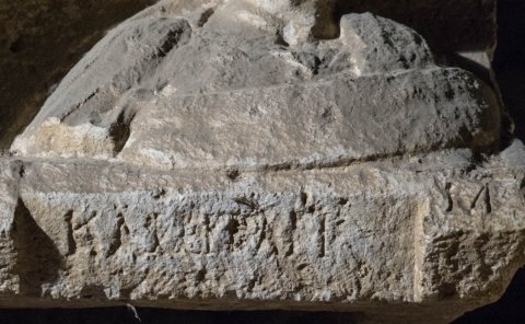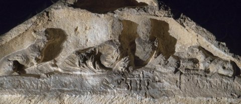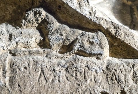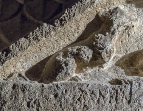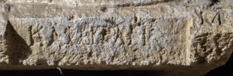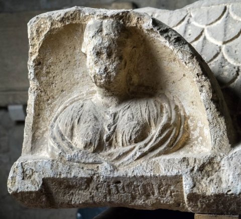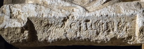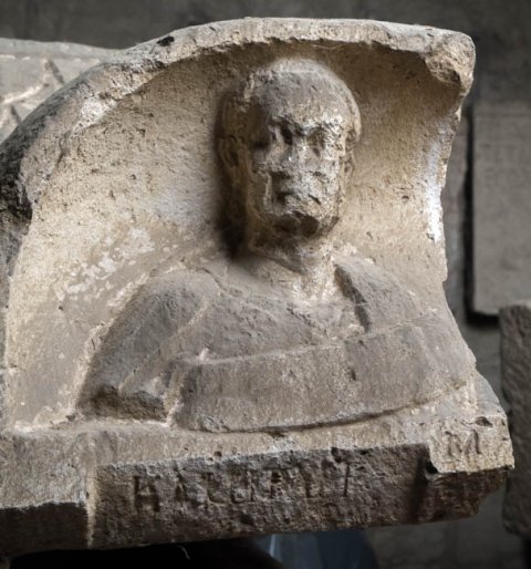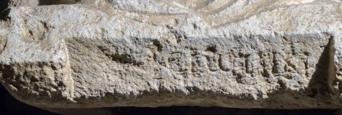 - Namensbeischriften unter den beiden Büsten der Eckakrotere, unter den zwei Hunden und dem Vogel des Giebelreliefs.