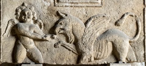 - Erot tränkt einen stehenden Greif aus einer Schale