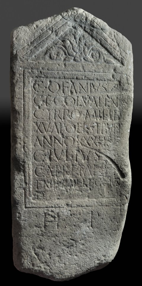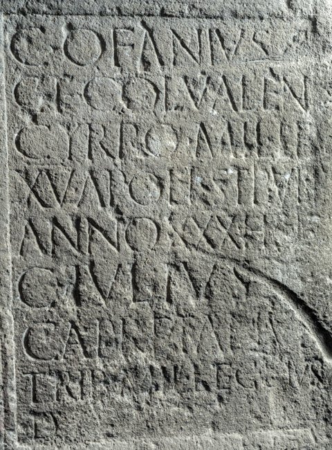 - C(aius) Ofanius / C(aii) f(ilius) Col(lina) Valens / Cyrro mil(es) leg(ionis) / XV Apoll(inaris) stip(endiorum) VIII / anno(rum) XXX h(ic) s(itus) e(st) / C(aius) Iulius / Capretanus / trib(unus) mil(itum) leg(ionis) eius/d(em) / h(eres) p(osuit)