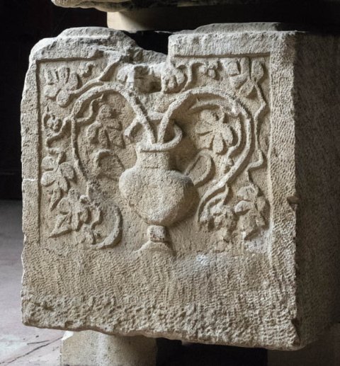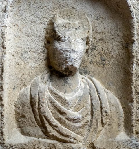 - Vorderseite: gerahmtes Schriftfeld zwischen Nischen mit Büsten (Ehepaar). Nebenseiten: Krater mit Weinranken.