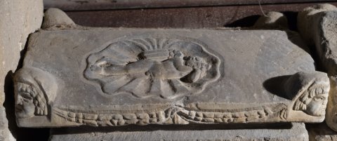 - Dachförmiger Deckel mit Eckakroteren mit Theatermasken, am Deckelrand Girlanden. Auf einer Dachseite Relief eines in einer Muschelschale schlafenden Eroten (Amor).
