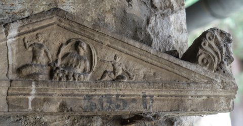 - Giebel mit Seitenakroteren (Palmette). Im profiliert gerahmten Giebelfeld mythische Figur: gelagerte, nach links gewandte bekleidete Frau (Tellus ?) mit Velum hinter dem aufgerichteten Oberkörper und Früchten vor sich. Rechts von ihr auf dem Boden sitzender Knabe, hinter den Beinen der Frau stehender (?) Knabe, beide nackt und mit erhobenem rechtem Arm nach links schauend.