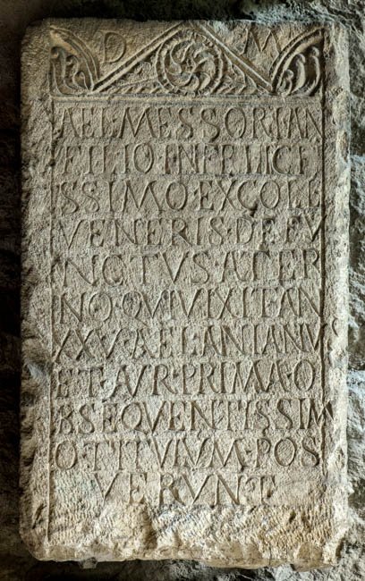 - D(is) M(anibus) // Ael(io) Messoriano / filio infelici/ssimo ex coll(egio) / Veneris defu/nctus Ater/no qui vixit an(nos) / XXXV Ael(ius) Anianus / et Aur(elia) Prima o/bsequentissim/o titulum pos/uerunt