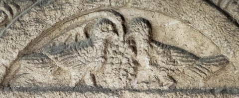 - Über dem Schriftfeld Bogenfeld mit zwei Vögeln (Tauben) mit Weintraube. In den oberen Zwickeln Palmetten und Zweige.