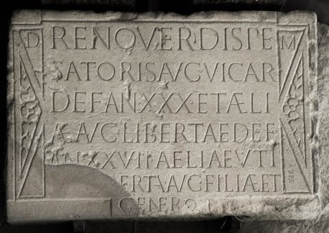 - D(is) M(anibus) // Renoveri(?) dispe(n)/satoris Aug(usti) vicar(io?) / def(uncto?) an(norum) XXX et Aeli/ae Aug(usti) libertae def(unctae) / an(norum) XXVII Aelia Euti/[ches! li]berta Aug(usti) filiae et / [g]enero