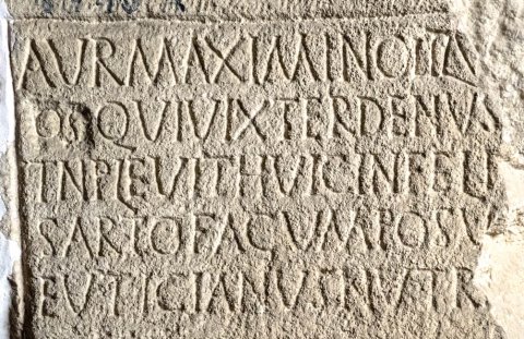 - Aur(elio) Maximino ITLV(?)[---]/[--] qui vix(it) ter denus(!) [annos] / inplevit huic infeli[ci hunc?] / sartofacum(!) posu[it Aur(elius)?] / Eutic(h)ianus(!) nutri[tor]
