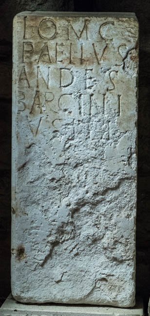 - I(ovi) O(ptimo) M(aximo) C(onservatori?) / P(ublius) Aelius / Andes / Barcini / v(otum) s(olvit) l(ibens) m(erito)