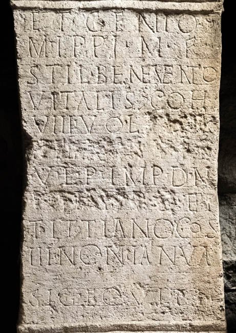 - I(ovi) O(ptimo) M(aximo) // et Genio / M(arcus) Ippi(us) M(arci) f(ilius) / Stil(latina)! Benevento / Vitalis |(centurio) coh(ortis) / VIII vol(untariorum) [[[Phi]]]/[[[lippianae]]] / v(otum) l(ibens) p(osuit) Imp(eratore) d(omino) n(ostro) / [[[Philippo]]] et / Tittiano co(n)s(ulibus) / III Non(as) Ianua(rias) / sig(no) Equitii