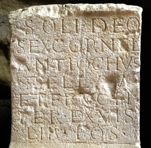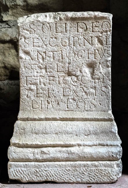 - Soli deo / Sex(tus) Cornel(ius) / Antiochus / stellam / et fructi/fer(am) ex vis(u) / lib(ens) pos(uit)