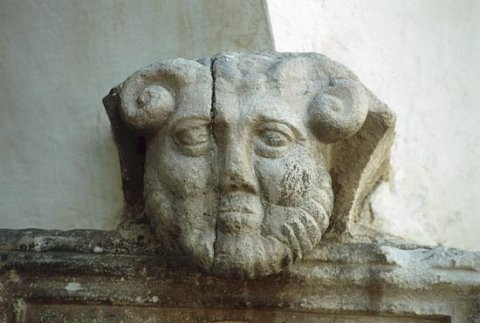 - auf der Stirnseite mythische Figur (Jupiter Ammon): bärtiger Kopf mit Widderhörnern