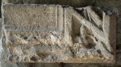 - Rechte untere Ecke einer tabula ansata, keine Inschrift erhalten. In der ansa Reliefrest, im unteren Zwickel sitzende Figur mit phrygischer Mütze.