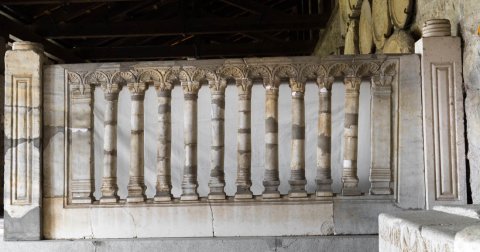 - Altarschranke: in einem Rahmen Reihe von zehn Säulchen, über den Interkolumnien Bogenfelder mit Palmetten, seitlich Pilaster, ganz außen quadratische Pfeiler mit runden Aufsätzen.