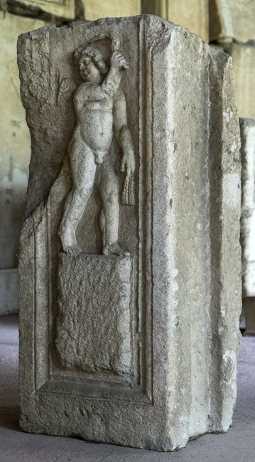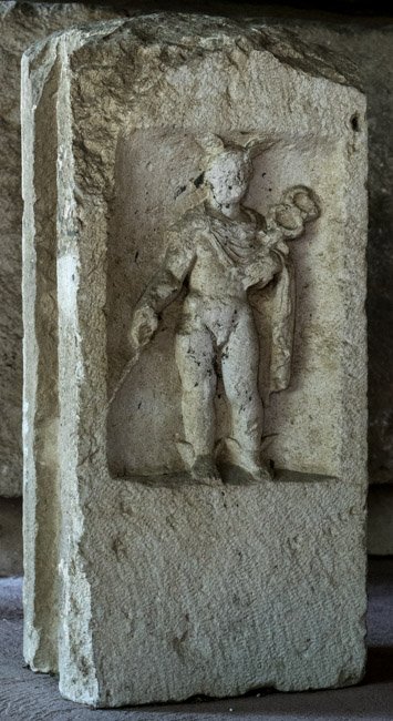 Auf der Rückseite eingetiefte Bildnische, darin stehender Mercur mit Flügelkappe und -schuhen, im linken Arm Caduceus, in der Rechten Stab. In den Nebenseiten Falz. Pfeiler von der Einfriedung eines Grabbezirks ?