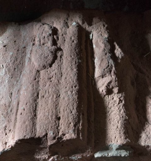 - Unterer Teil einer stehenden Frau in langem Gewand, rechte Hand mit Gefäß oder Tasche. Teil eines Grabreliefs ?