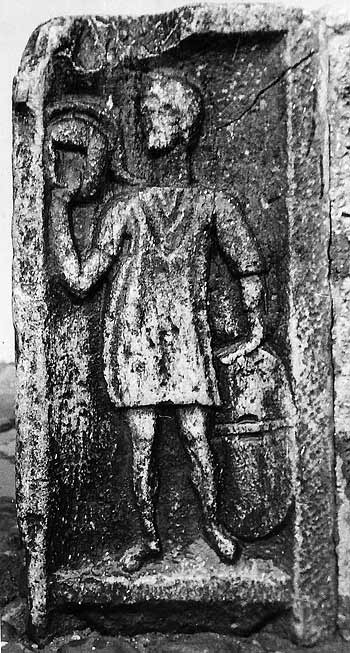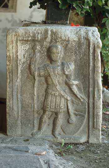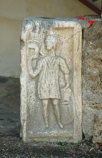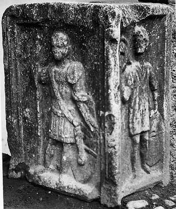 Auf der rechten Nebenseite Diener: in Rechtecknische Mann in kurzer Tunica, in der Rechten Helm mit Helmbusch, in der Linken Schild.