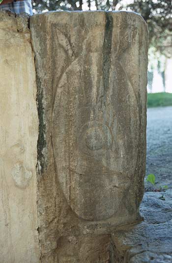 Auf der Vorderseite in Rechteckfeld Ganzfigur eines Mannes (Offizier): Panzer mit Pteryges, Streifenschurz und Schulterlaschen, auf der linken Schulter Mantelbausch. Waffen: Schwertgurt (Balteus), Schwert in Scheide mit Dosenortband, in der Rechten Lanze, die Linke auf Schild gestützt.