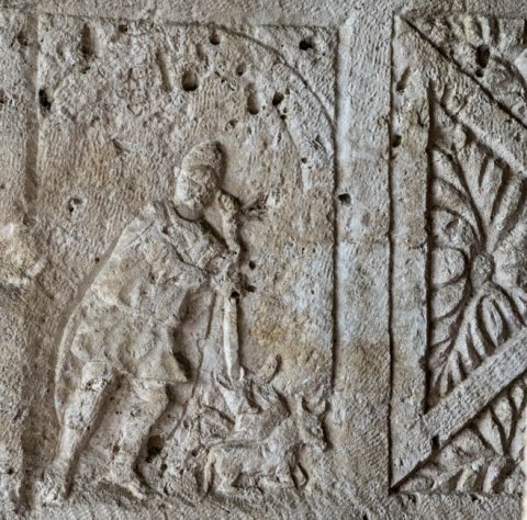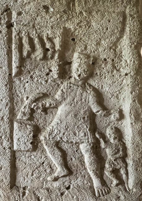 - tabula ansata mit Blattdekor. In den Seitenfeldern links auf einen Stab gestützter Hirte mit liegenden Tieren, rechts Schmied am Amboss mit kleinem Diener.