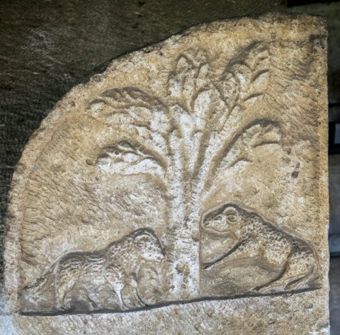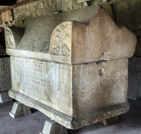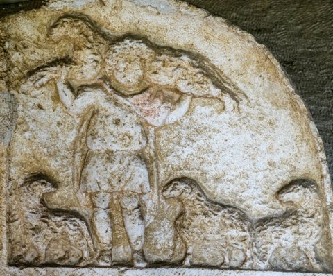 - Dachförmiger Deckel mit Eckakroteren, auf den Akroteren der Vorderseite Reliefs. Links Guter Hirte, rechts Baum und zwei Widder. Inschrift in tabula ansata mit Blattdekor.