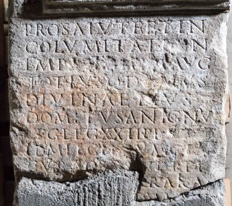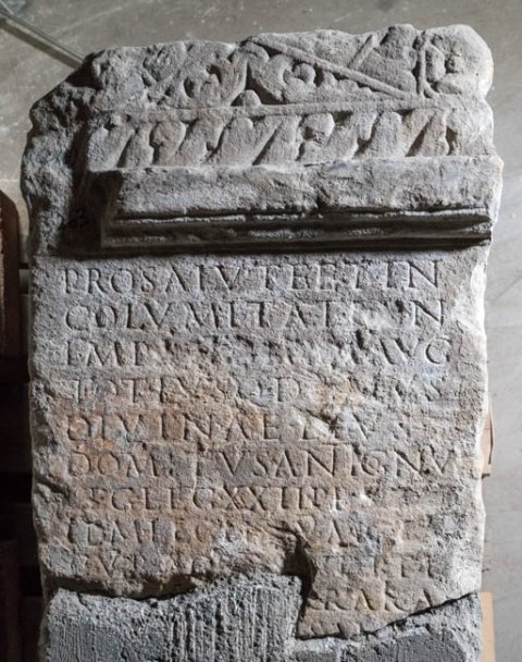 - [------]? // pro salute et in/columitate d(omini) n(ostri) / Imp(eratoris) [[An[t]on[ini]]] Aug(usti) / totiusq(ue) domus / divinae eius / Domitius Antigonus / leg(atus) leg(ionis) XXII Pr(imigeniae) [[p(iae) f(idelis) A[nt(oninianae)]]] / item leg(atus) leg(ionis) V Mac(edonicae) [[An[t(oninianae)]]] / curator [r(ei) p(ublicae) T]uderti[n(orum)] / [proc(urator) Aug(usti) fe]rrariar(um) / [---]SAI[---