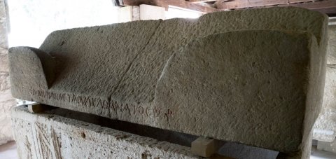 - Dachförmiger Deckel mit Eckakroteren. Auf der linken Schmalseite im Giebel Christogramm mit Alpha und Omega zwischen zwei Tauben, auf dem links anschließenden Akroter Kreuz. Auf der anderen Längsseite auf dem Deckelrand Inschrift zwischen Kreuz und Christogramm.