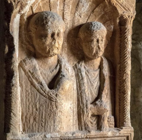 - Offener Giebel auf Säulen mit Spiralkanneluren, Palmettenakrotere. Muschelnische mit Halbfiguren eines älteren und eines jüngeren Mannes im Mantel.