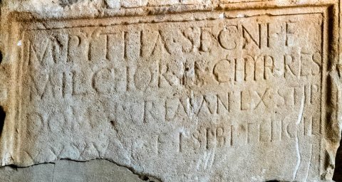 - M(arcus) Pytha Segni f(ilius) / mil(es) c(o)hor(tis) II Chyrr(h)es(ticorum) / dom(o) Berea an(norum) LX stip(endiorum) / XXXV t(estamento) f(ieri) i(ussit) sibi Felici l(iberto)