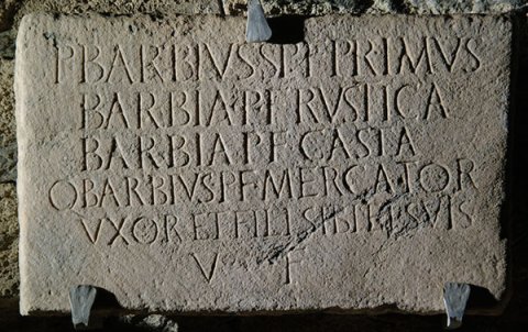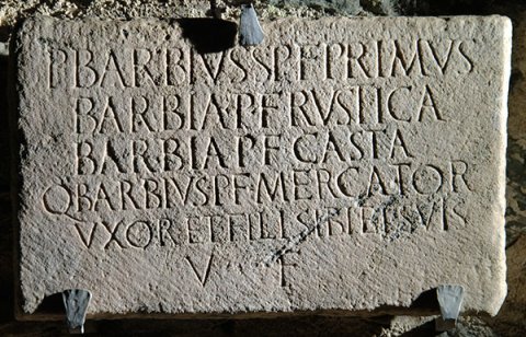 - P(ublius) Barbius Sp(urii) f(ilius) Primus / Barbia P(ublii) f(ilia) Rustica / Barbia P(ublii) f(ilia) Casta / Q(uintus) Barbius P(ublii) f(ilius) Mercator / uxor et fili(i) sibi et suis / v(ivi) f(ecerunt)