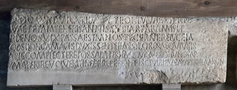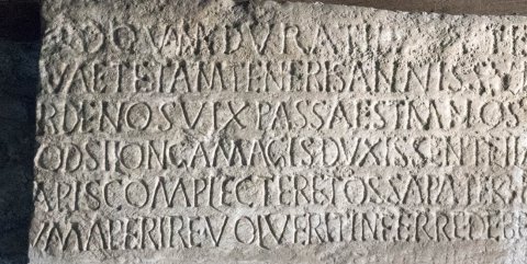 - O quam dura tibi [fu]it fortuna Paterne / quae te tam teneris annis sub Tartara misit / [te]r denos vix passa est annos te cernere lucem / [qu]od si longa magis duxissent fila sorores aequius is/[te l]apis complecteret ossa paterna si quis vero hunc sar/[cofag]um aperire voluerit inferre debebit fisci viribus auri libram un[am]