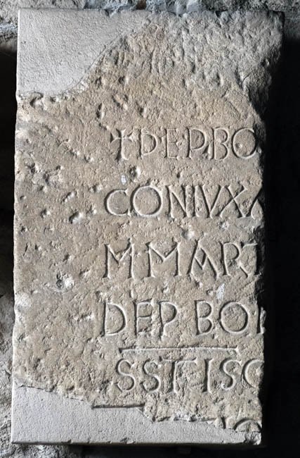 - Dep(ositio) bo[nae memoriae ---] / coniux A[---] / MMART[---] / dep(ositio) bon[ae memoriae ---] / SSTIS O(?)[---] / [---]I(?)O(?)[---] / [---