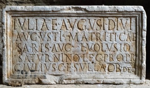 - Iuliae August(ae) divi / Augusti matri Ti(beri) Cae/saris Aug(usti) L(ucio) Volusio / Saturnino leg(ato) pro pr(aetore) / C(aius) Iulius C(ai) f(ilius) Sulla ob dec(urionatum)