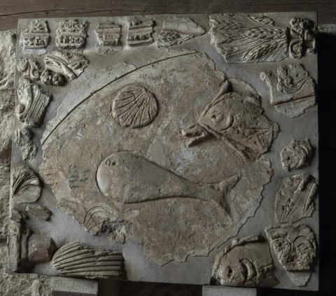 - Kreisförmiges Feld mit Fischen und Muscheln, die nicht anpassenden Fragmente tlw. von einem ornamentierten Rahmenprofil, tlw. mit Muscheln und Ähren (?). Fragmente zusammengehörig ?