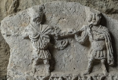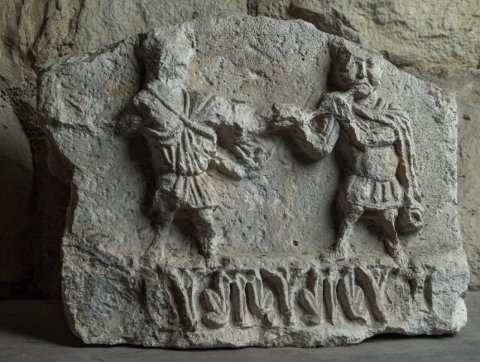 - Musikinstrument. Zwei Männer in Schrittstellung, der linke in kurzer Tunica und Sandalen, mit Schwertgurt, der rechte, in Panzer (?), Mantel und Sandalen, bläst in eine Tuba. Am unteren Rand Palmettenfries.