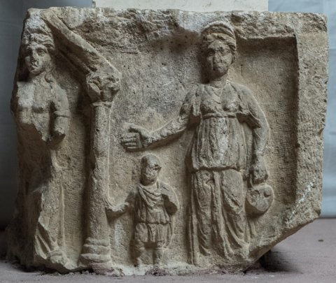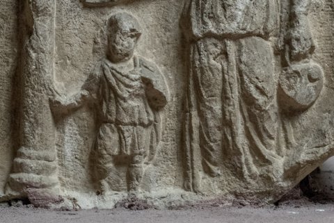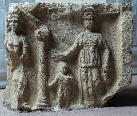 - Mythische Figur: in der Mitte Aedicula mit offenem Giebel auf Säulen, darin stehende Venus mit Diadem und Reif am linken Oberarm. Rechts Frau (Kaiserin ?) mit Diadem und hoch gegürtetem Gewand mit Überschlag, in der Linken Tasche (?), die Rechte ist über den Kopf eines neben ihr stehenden Knaben im Sagum ausgestreckt.