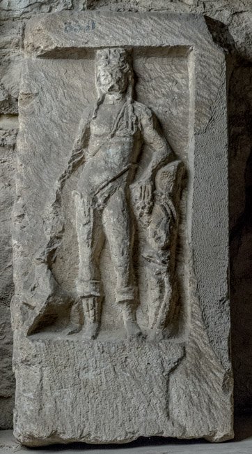 - Mythische Figur: Liber Pater (Dionysos) mit Nebris und Stiefeln, linker Arm auf Baumstamm mit Weinranken gelehnt, in der Rechten Schale, neben dem rechten Fuß Panther.