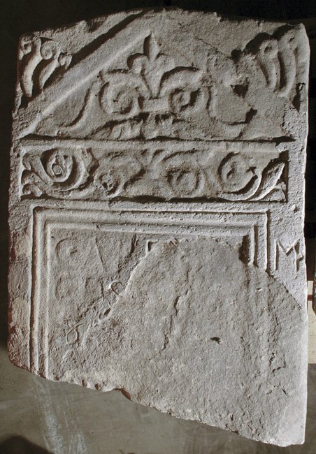 - Eingeschriebener Giebel mit Akanthuskelch mit Ranken, Palmettenakrotere. Im Zwischenfries Volutenranken.