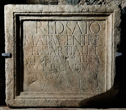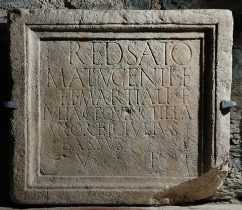 - Redsato / Matugenti f(ilio) / et Martiali f(ilio) / Iulia C(ai) f(ilia) Quinctilla / uxor et C(aius) Iulius / Bassus f(ilius) / v(ivi) f(ecerunt)