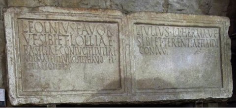 - L(ucius) Folnius Favor / v(ivus) f(ecit) sibi et Lolliae / Basiliae coniugi et Iuliae / Noemae et Ti(berio) Iulio Stephano et / Attiae Soteridi // L(ucius) Iulius L(uci) l(ibertus) Herma v(ivus) f(ecit) / sibi et Terentiae Haidi / coniugi