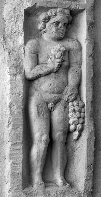 - Schmales Rechteckfeld, darin stehender nackter Knabe (Satyr ?) mit Weintraube in der Linken, die Rechte hält einen Becher vor der Brust. Über dem Relieffeld Reste eines Waffenreliefs (gekreuzte Ovalschilde). Teil eines Grabbaus ?