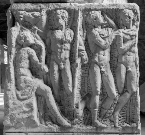 Auf der Vorderseite Mythos: kalydonische Eberjagd (Meleager), auf den Nebenseiten Jagdgefolge (links vier Jünglinge, Pferd und Hund, rechts zwei Jünglinge mit Pferd, ein Mann im Mantel und ein Mann in kurzer Tunica und Mantel). Rückseite: stark zerstörtes vielfiguriges Relief. - Inschrift