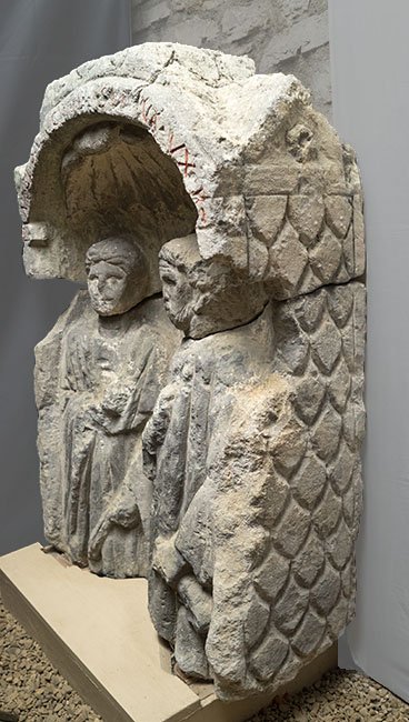 - Stehendes Ehepaar in einer Bogennische mit Muschel, Reste von Akroteren. Nebenseiten geschuppt, oben Giebel mit Rosette. Inschrift auf dem Bogenrahmen.