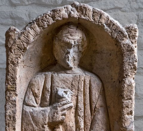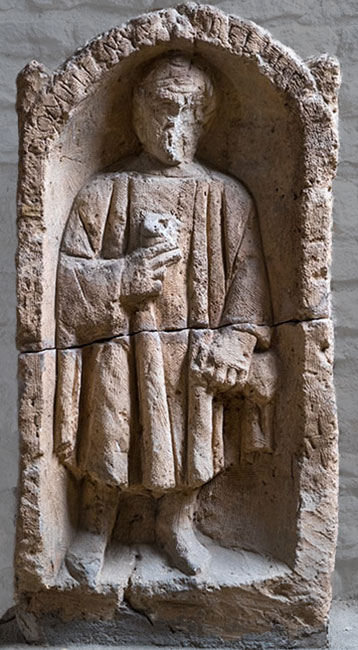 - In einer Bogennische mit Akroteren stehender bärtiger Mann mit Becher und Geldbeutel in den Händen. Inschrift auf dem Bogenrahmen.